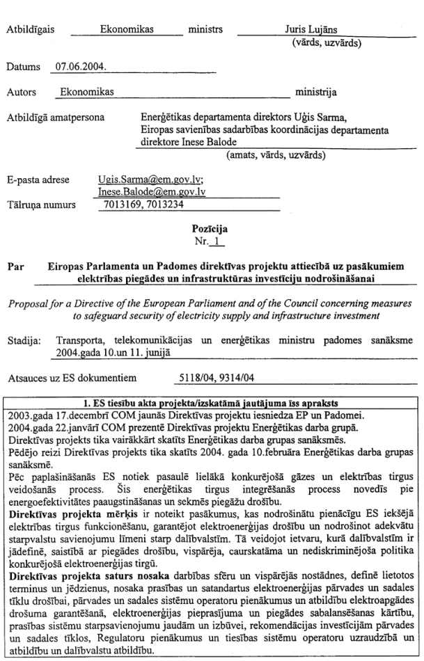 1.3. pozīcija Nr.1 “Eiropas Parlamenta un padomes direktīvas projekts attiecībā uz pasākumiem elektrības piegādes un infrastruktūras investīciju nodrošināšanai”;