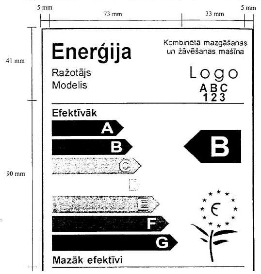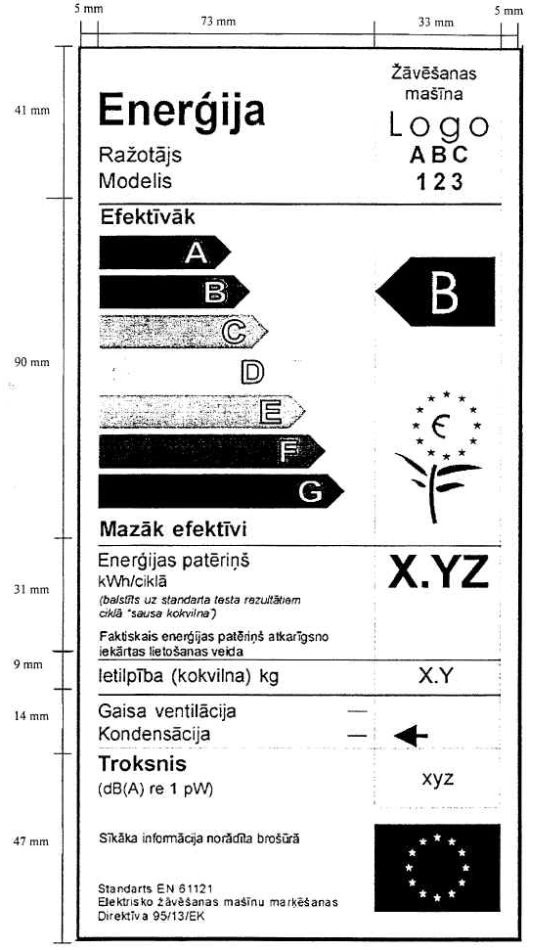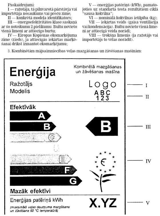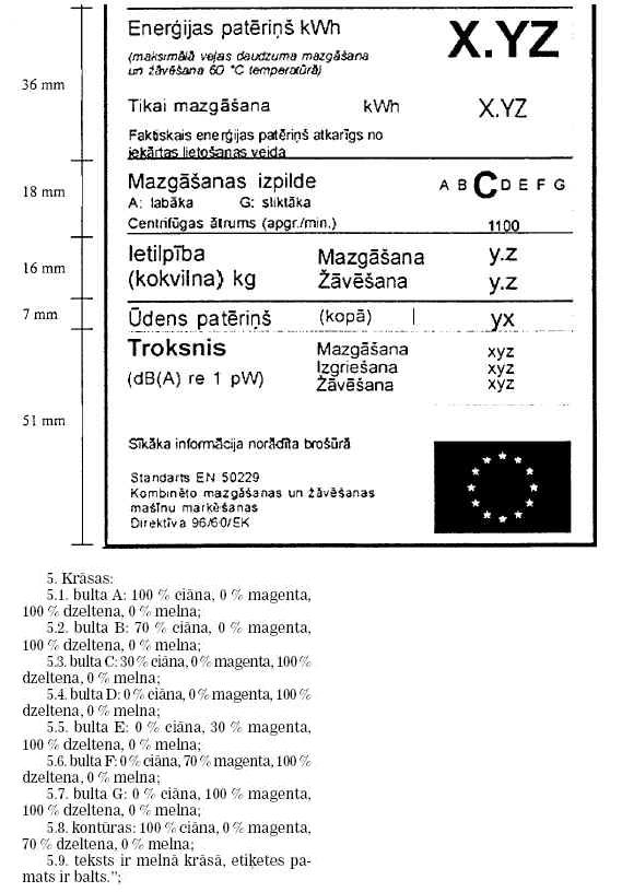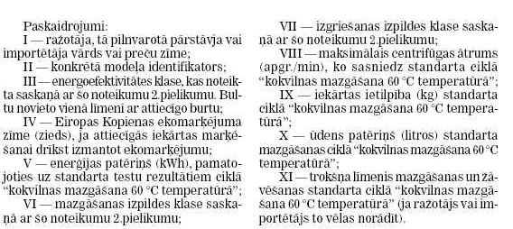 “13.7. izgriešanas izpildes klase saskaņā ar šo noteikumu 2.pielikumu. To norāda šādi: “Izgriešanas izpilde ... uz skalas no A (labāka) līdz G (sliktāka)”. Seko norāde: “Atcerieties! Izvēloties veļas mazgāšanas mašīnu ar A centrifūgu G centrifūgas vietā, Jūs samazināsiet žāvēšanas izmaksas uz pusi. Drēbju žāvēšana parasti patērē vairāk enerģijas nekā to mazgāšana”. Šo norādi var ietvert arī piezīmē. Ja informāciju par izgriešanas izpildes klasi sniedz tabulā, to var izteikt citādi, bet skaidri norādot, ka mērījumu skala ir no A (labāka) līdz G (sliktāka), un norādot, ka ziņas par ekspluatācijas izmaksām ietvertas tabulā vai piezīmē. Šo informāciju var sniegt arī par citiem mazgāšanas cikliem;