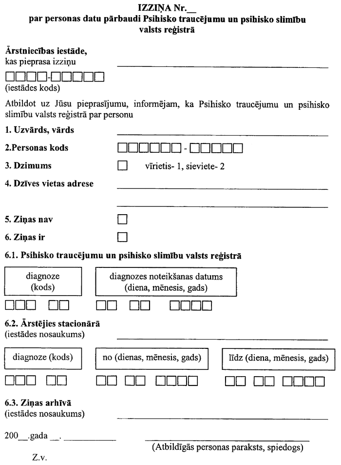 7. Izziņu par personas datu pārbaudi Psihisko traucējumu un psihisko slimību valsts reģistrā aizpilda par katru personu, par kuru saņemts ārstniecības iestādes vai institūcijas, kas veic izziņu vai izpilda tai ar likumu noteiktos pienākumus, pieprasījums izziņas izsniegšanai no Psihisko traucējumu un psihisko slimību valsts reģistra.