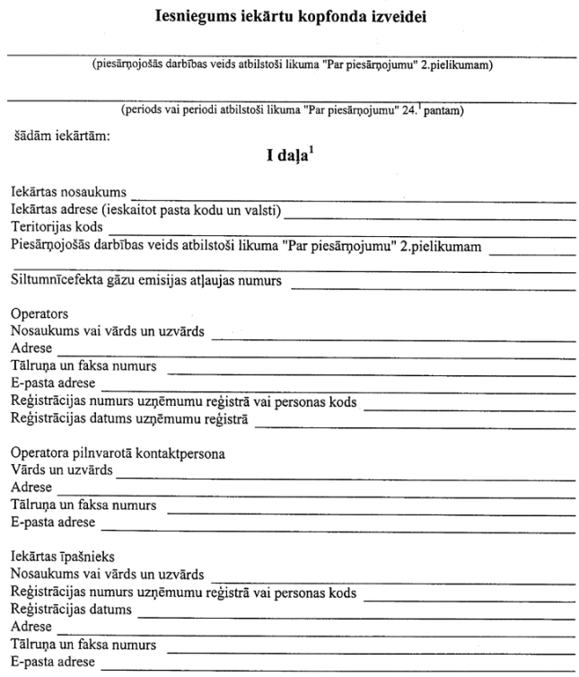 19. Operatori, kuri vēlas izveidot iekārtu kopfondu, rakstiski un elektroniski iesniedz Latvijas Vides aģentūrā iesniegumu par iekārtu kopfonda izveidi (pielikums) un operatoru izvēlētās pilnvarotās personas piekrišanu. Ja iekārtu kopfondu paredzēts veidot likuma 24.1 pantā minētajam pirmajam periodam vai pirmajam un otrajam periodam, iesniegumu iesniedz līdz 2004.gada 1.novembrim. Ja iekārtu kopfondu paredzēts veidot likuma 24.1 pantā minētajam otrajam periodam, iesniegumu iesniedz līdz 2007.gada 1.septembrim.