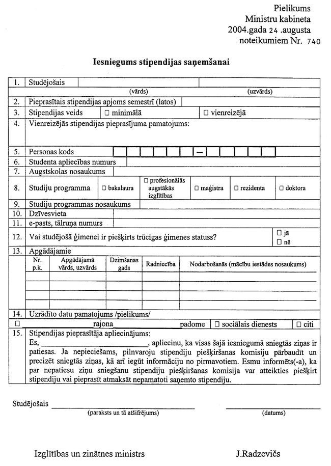 9. Lai varētu saņemt šo noteikumu 4.punktā minēto stipendiju, pretendents augstākās izglītības iestādes stipendiju piešķiršanas komisijai iesniedz iesniegumu stipendijas saņemšanai (pielikums).
