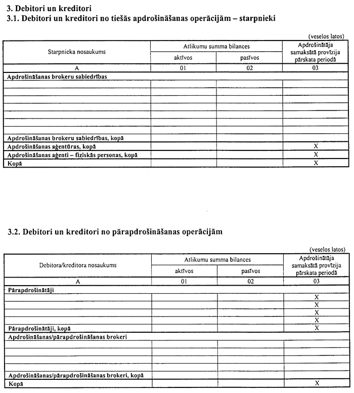 4.2.2. pārskata 3.3.daļā “Pārējie debitori un citi kreditori” sniedz attiecīgo pārskata 1.daļas pozīciju izvērsumu darījumiem, kuru bilances vērtība pārsniedz 5000 latus, izņemot nedalībvalstu nedzīvības apdrošinātāju filiāles, kas sniedz pilnu šo pozīciju izvērsumu;