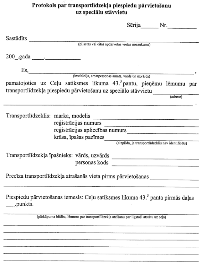 8.6. sastāda protokolu par transportlīdzekļa piespiedu pārvietošanu uz speciālu stāvvietu (turpmāk — pārvietošanas protokols) (1.pielikums) četros eksemplāros (viens — institūcijai, kuras amatpersona sastādījusi pārvietošanas protokolu, otrs — specializētā transportlīdzekļa vadītājam, trešais — stāvvietas atbildīgajam dežurantam, ceturtais — transportlīdzekļa īpašniekam vai viņa pilnvarotai personai);