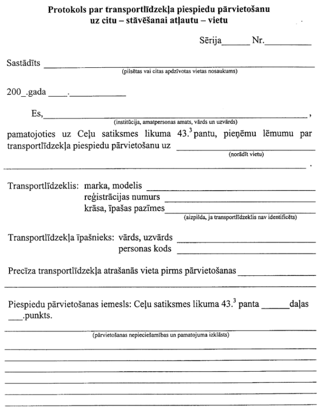 16.2.4. sastāda protokolu par transportlīdzekļa piespiedu pārvietošanu uz citu — stāvēšanai atļautu — vietu (2.pielikums) trijos eksemplāros (viens — institūcijai, kuras amatpersona sastādījusi minēto protokolu, otrs — specializētā transportlīdzekļa vadītājam, trešais — piestiprināts pārvietotajam transportlīdzeklim);