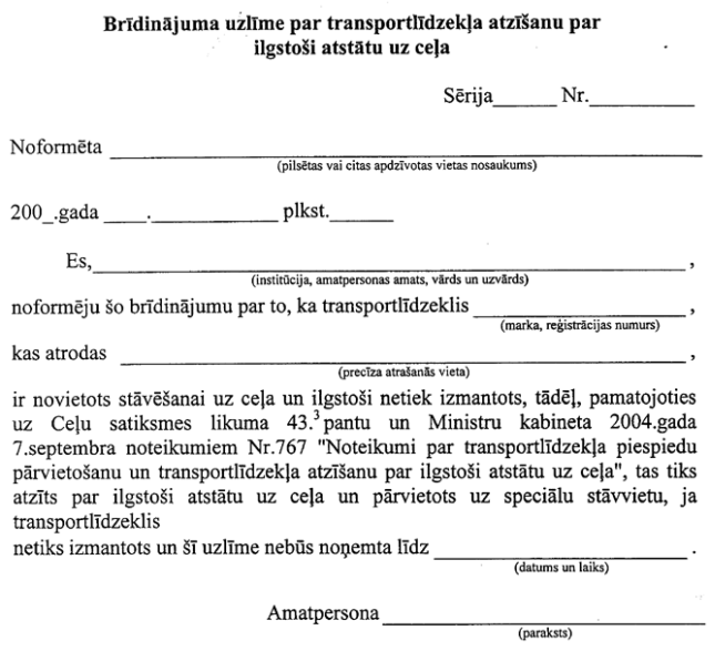 20.3. tas novietots stāvēšanai uz ceļa, netiek izmantots ilgāk par 15 diennaktīm, ko apliecina brīdinājuma uzlīme uz transportlīdzekļa (3.pielikums), un transportlīdzeklim nav veikta valsts tehniskā apskate.