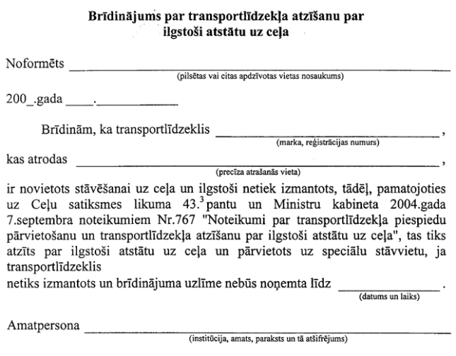 20.2. tas novietots stāvēšanai uz ceļa un netiek izmantots ilgāk par pašvaldības noteikto laiku, bet ne mazāk par 45 diennaktīm, ko apliecina brīdinājuma uzlīme uz transportlīdzekļa (3.pielikums);