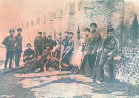 Latviešu strēlnieki pie Kremļa sienas Maskavā |