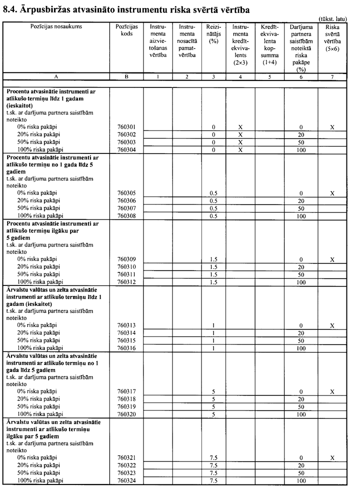 2.26. Tirgus risks — iespēja ciest zaudējumus bilances un ārpusbilances posteņu pārvērtēšanas dēļ, kas saistīta ar finanšu instrumentu, preču un preču atvasināto instrumentu tirgus cenas izmaiņām, kuras notiek valūtas kursu, procentu likmju izmaiņu u.c. faktoru ietekmē. Tirgus riski ir ārvalstu valūtas risks, pozīcijas risks, preču risks, norēķinu risks un darījuma partnera risks.