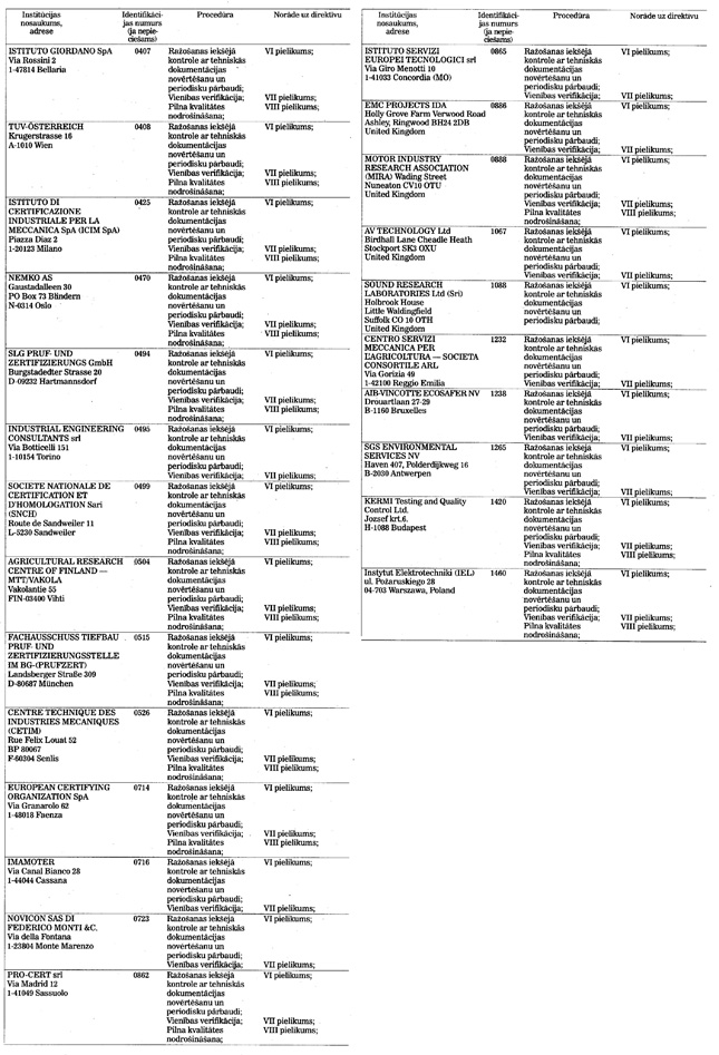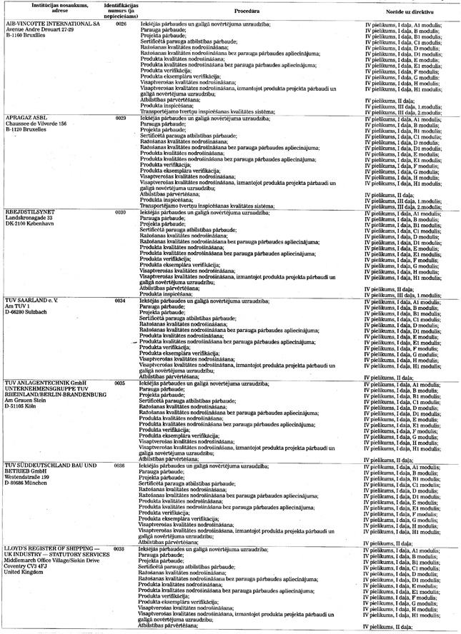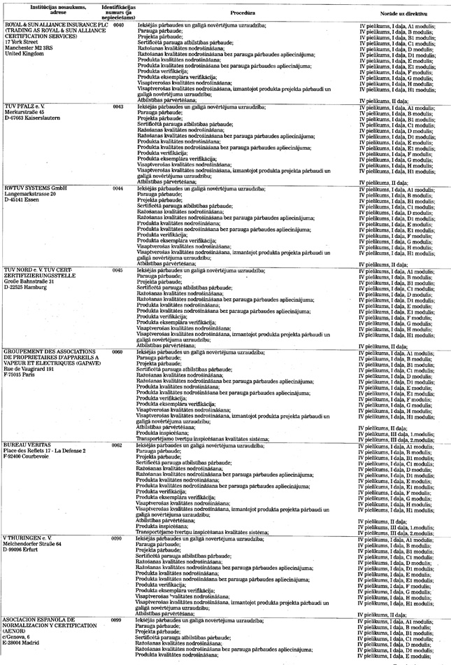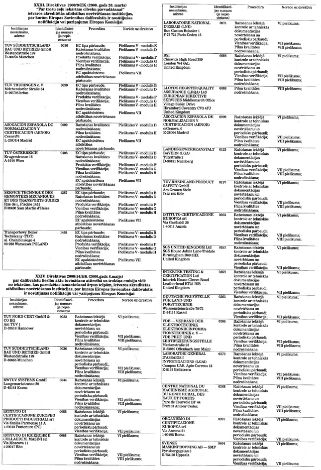 XXII. Direktīvas 1999/36/EK (1999.gads 29.aprīlis) “Par transportējamām spiedieniekārtām” ietvaros akreditētās atbilstības novērtēšanas institūcijas, par kurām Eiropas Savienības dalībvalstis ir nosūtījušas notifikāciju vai paziņojumu Eiropas Komisijai