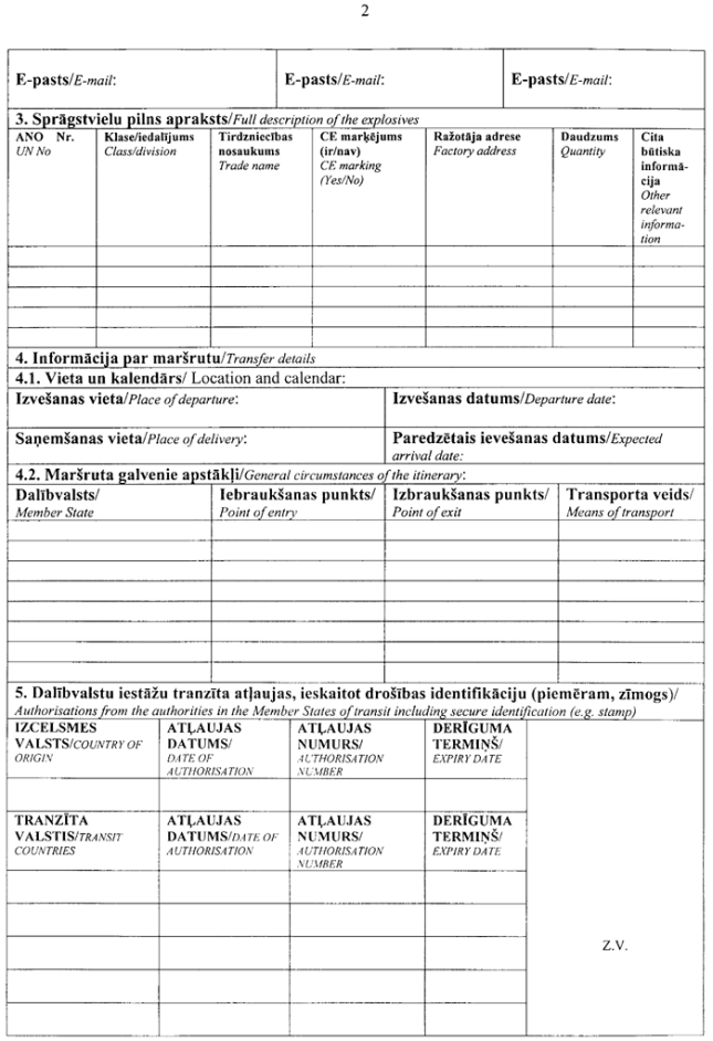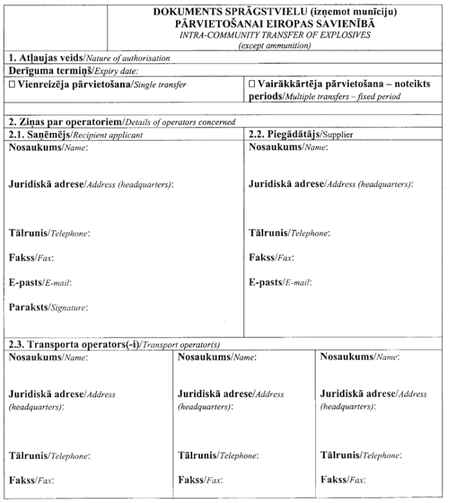 "250.1 Pirms sprāgstvielu un spridzināšanas ietaišu pārvadāšanas Eiropas Ekonomikas zonas valstīs komersantam ir jāsaņem dokuments sprāgstvielu pārvietošanai Eiropas Savienībā (11.pielikums). Minēto dokumentu izsniedz Stratēģiskas nozīmes preču kontroles komiteja stratēģiskas nozīmes preču aprites kontroles dokumentu izsniegšanas un lietošanas normatīvajos aktos noteiktajā kārtībā. Stratēģiskas nozīmes preču kontroles komiteja dokumentu sastāda trijos eksemplāros, no kuriem viens paliek komersantam, otrs atrodas kopā ar preci līdz tās nogādāšanai preces saņēmējam, bet trešais paliek Stratēģiskas nozīmes preču kontroles komitejā."