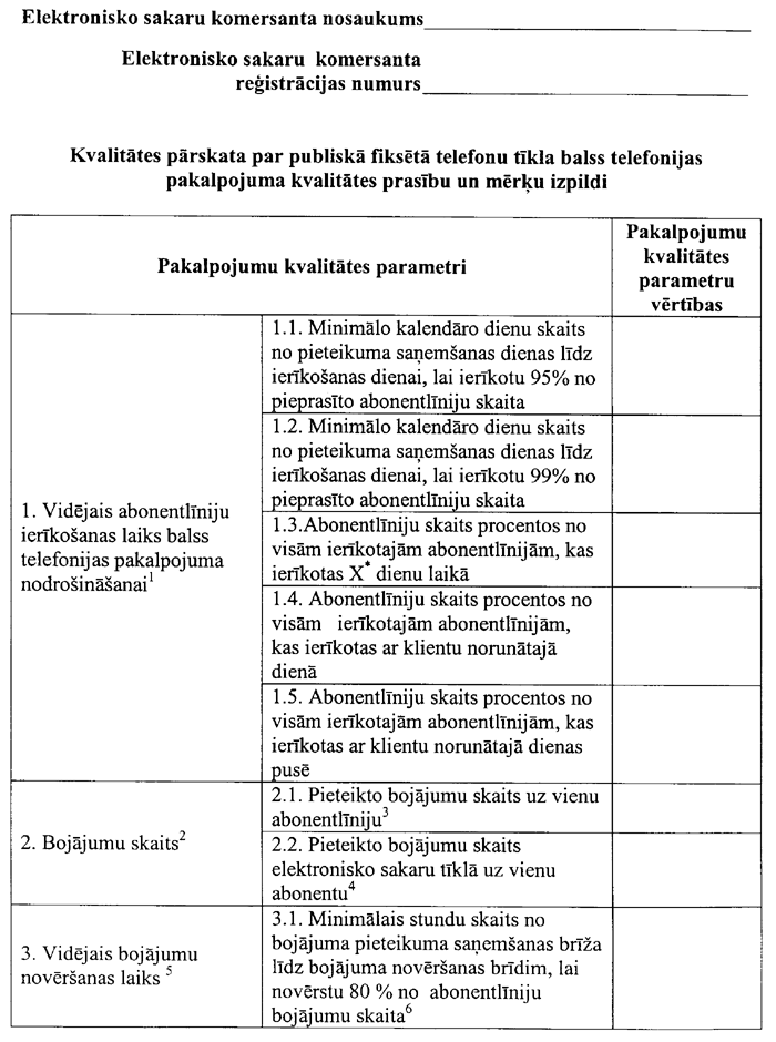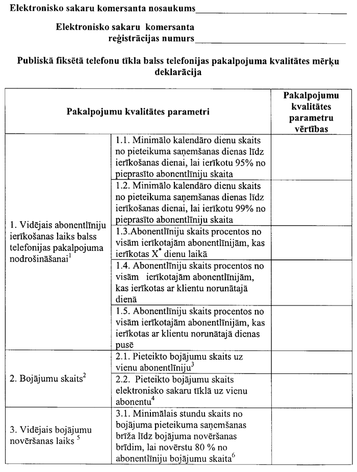 8. Komersants, kas sniedz publiskā fiksētā telefonu tīkla balss telefonijas pakalpojumu, iesniedz Komisijai pakalpojumu kvalitātes mērķu deklarāciju par esošo kalendāro gadu reizi gadā līdz 1.februārim. Ja komersants reģistrācijas paziņojumu nosūtījis Komisijai pēc esošā gada 1.janvāra, tad pakalpojumu kvalitātes mērķu deklarāciju tas iesniedz Komisijai divu mēnešu laikā no reģistrācijas paziņojuma nosūtīšanas brīža (1.pielikums).