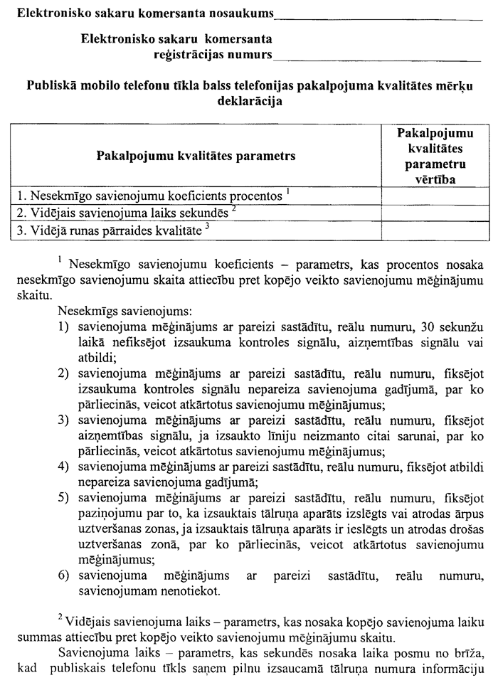 11. Komersants, kas sniedz publiskā mobilā telefonu tīkla balss telefonijas pakalpojumu, iesniedz Komisijai pakalpojumu kvalitātes mērķu deklarāciju par esošo kalendāro gadu reizi gadā līdz 1.februārim. Ja komersants reģistrācijas paziņojumu nosūtījis Komisijai pēc esošā gada 1.janvāra, tad pakalpojumu kvalitātes mērķu deklarāciju tas iesniedz Komisijai divu mēnešu laikā no reģistrācijas paziņojuma nosūtīšanas brīža (4.pielikums).