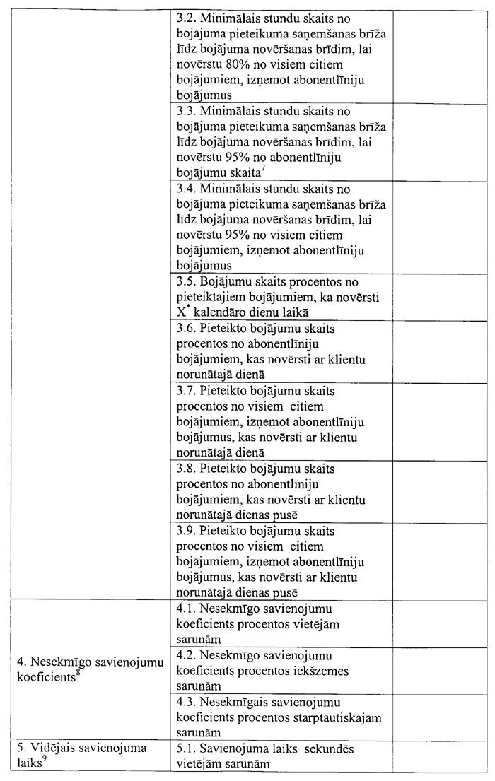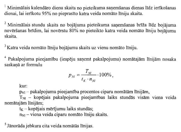 5 Bojājumu novēršanas laika uzskaiti jāattiecina uz pieslēguma punktu skaitu (tajā skaitā sapārotās, blīvētās abonentlīnijas, ISDN 30, PABX pieslēgumi ar R2-CAS un citi). ISDN BRA uzskaita kā vienu abonentlīniju.