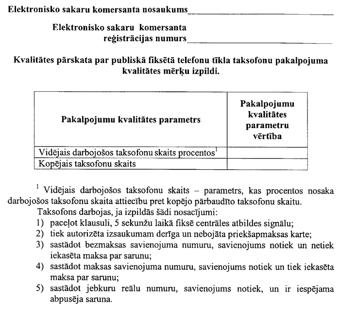 9. Komersants, kas sniedz publiskā fiksētā telefonu tīkla taksofonu pakalpojumu, iesniedz Komisijai pakalpojumu kvalitātes mērķu deklarāciju par esošo kalendāro gadu reizi gadā līdz 1.februārim. Ja komersants reģistrācijas paziņojumu nosūtījis Komisijai pēc esošā gada 1.janvāra, tad pakalpojumu kvalitātes mērķu deklarāciju tas iesniedz Komisijai divu mēnešu laikā no reģistrācijas paziņojuma nosūtīšanas brīža (2. pielikums).