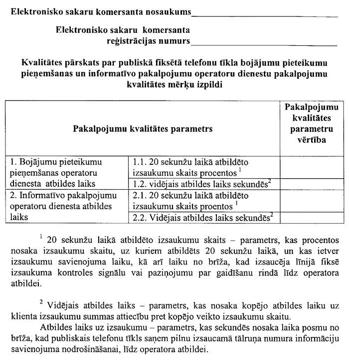 10. Komersants, kas sniedz publiskā fiksētā telefonu tīkla bojājumu pieteikumu pieņemšanas un informatīvo pakalpojumu operatoru dienestu pakalpojumus, iesniedz Komisijai pakalpojumu kvalitātes mērķu deklarāciju par esošo kalendāro gadu reizi gadā līdz 1.februārim. Ja komersants reģistrācijas paziņojumu nosūtījis Komisijai pēc esošā gada 1.janvāra, tad pakalpojumu kvalitātes mērķu deklarāciju tas iesniedz Komisijai divu mēnešu laikā no reģistrācijas paziņojuma nosūtīšanas brīža (3.pielikums).