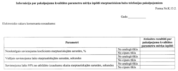 13. Komersants, kas sniedz nomāto līniju pakalpojumu, iesniedz Komisijai pakalpojumu kvalitātes mērķu deklarāciju par esošo kalendāro gadu reizi gadā līdz 1.februārim. Ja komersants reģistrācijas paziņojumu nosūtījis Komisijai pēc esošā gada 1.janvāra, tad pakalpojumu kvalitātes mērķu deklarāciju tas iesniedz Komisijai divu mēnešu laikā no reģistrācijas paziņojuma nosūtīšanas brīža (6. pielikums).