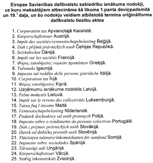 Eiropas Savienības dalībvalstu sabiedrību ienākuma nodokļi, uz kuru maksātājiem attiecināma šā likuma 1.panta deviņpadsmitā un 19.1 daļa, un šo nodokļu veidiem atbilstošā termina oriģinālforma dalībvalstu tiesību aktos