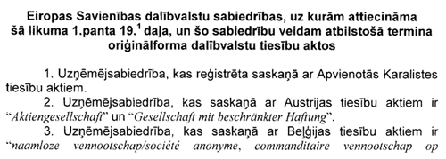 Eiropas Savienības dalībvalstu sabiedrības, uz kurām attiecināma šā likuma 1.panta 19.1 daļa, un šo sabiedrību veidam atbilstošā termina oriģinālforma dalībvalstu tiesību aktos
