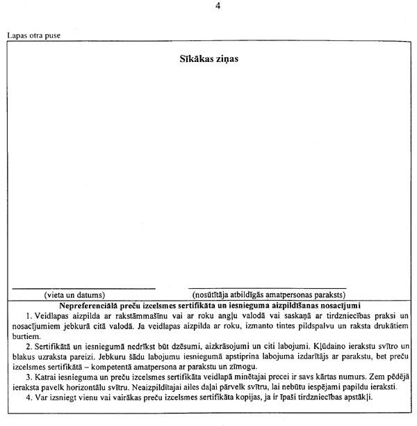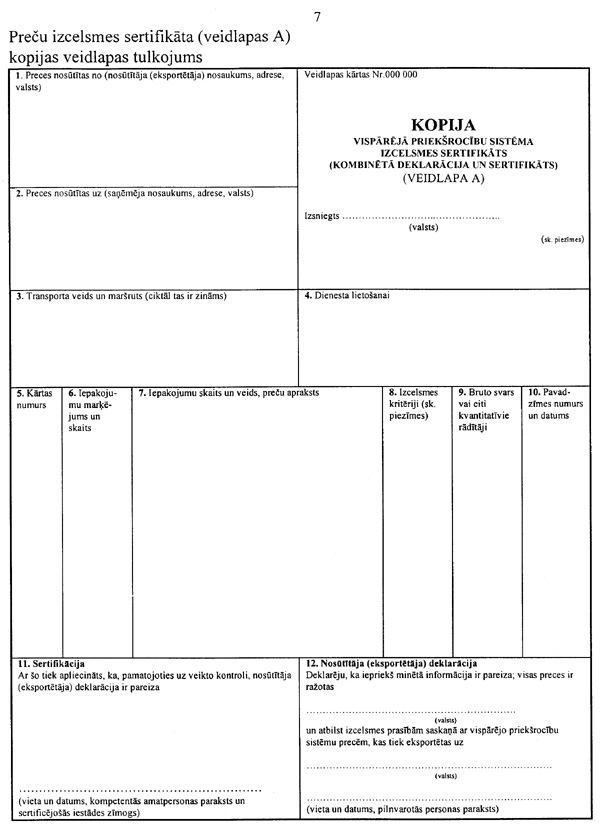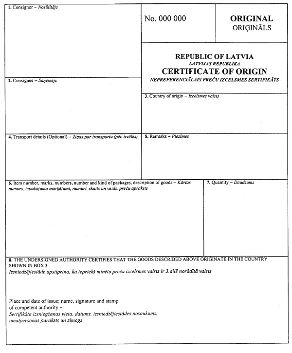 7. Nepreferenciālā preču izcelsmes sertifikāta (1.pielikums) veidlapas formāts ir A4 (210 x 297 mm). Ir pieļaujama -5 mm vai +8 mm atkāpe no noteiktā izmēra. Izmantojams balts rakstāmpapīrs (bez mehāniskiem celulozes piemaisījumiem), kas sver vismaz 25 g/m2. Sertifikātam ir sarkanbrūns fons ar pītu lentīšu reljefu, lai būtu iespējams atklāt mehāniskus vai ķīmiskus viltojumus.