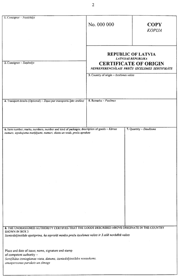 2. Ja, ievedot preces, to izcelsmi pierāda, uzrādot preču izcelsmes sertifikātu, nepreferenciālajam preču izcelsmes sertifikātam jāatbilst šādām prasībām: