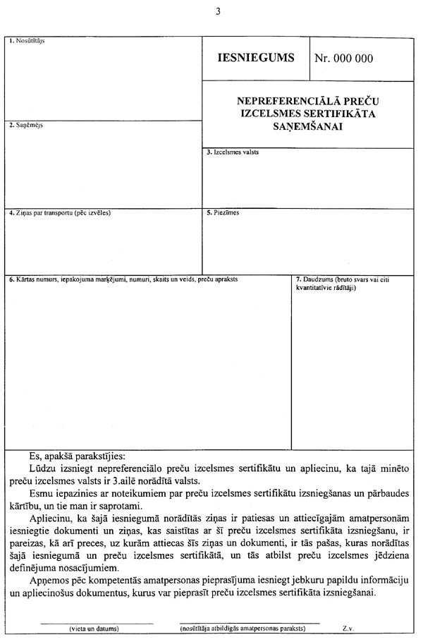 Nepreferenciālā preču izcelsmes sertifikāta veidlapa un iesniegums sertifikāta saņemšanai