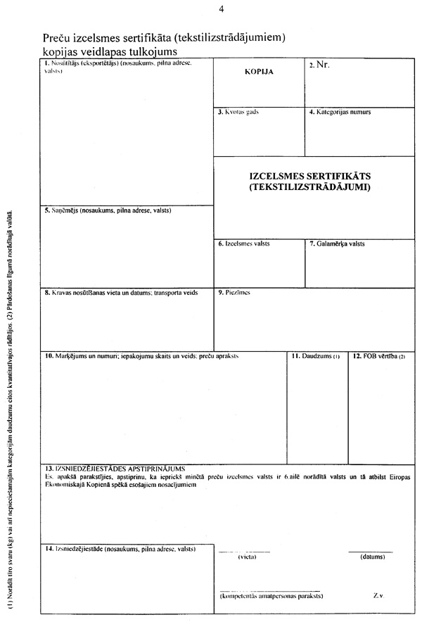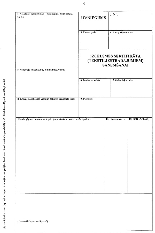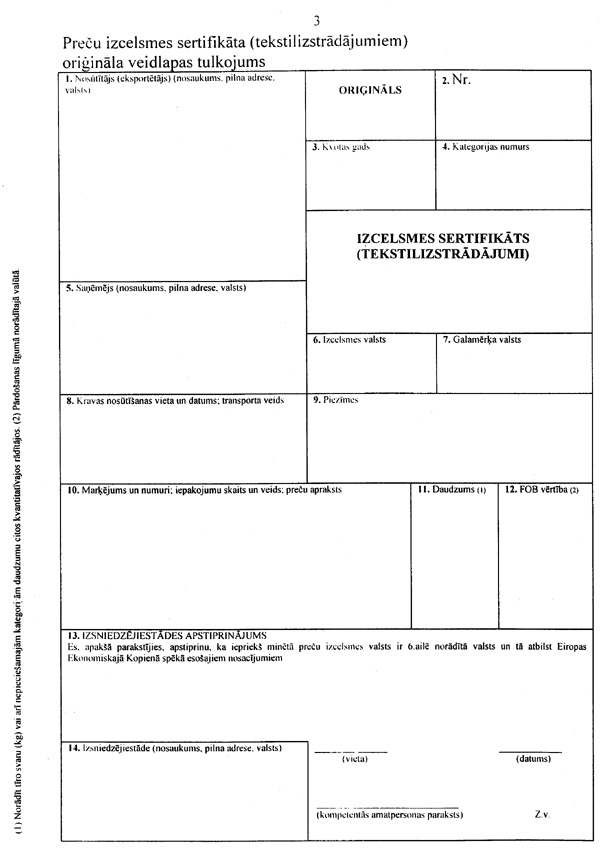 Preču izcelsmes sertifikāta (tekstilizstrādājumiem) veidlapa un iesniegums sertifikāta saņemšanai