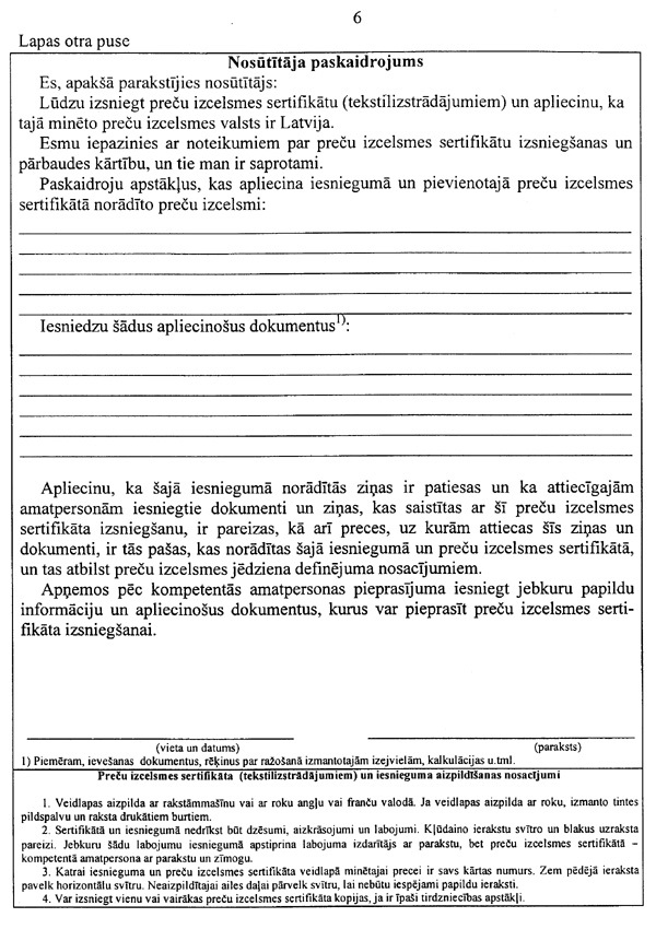 14.1. aizpildītu preču izcelsmes sertifikāta veidlapu un iesniegumu. Iesnieguma veidlapas otrā pusē pamato nosūtāmās preces atbilstību preču izcelsmes noteikumiem (piemēram, norāda nosūtāmās preces kodu un tās ražošanā izmantoto izejmateriālu preču kodus, kā arī iesniegto dokumentu numurus);