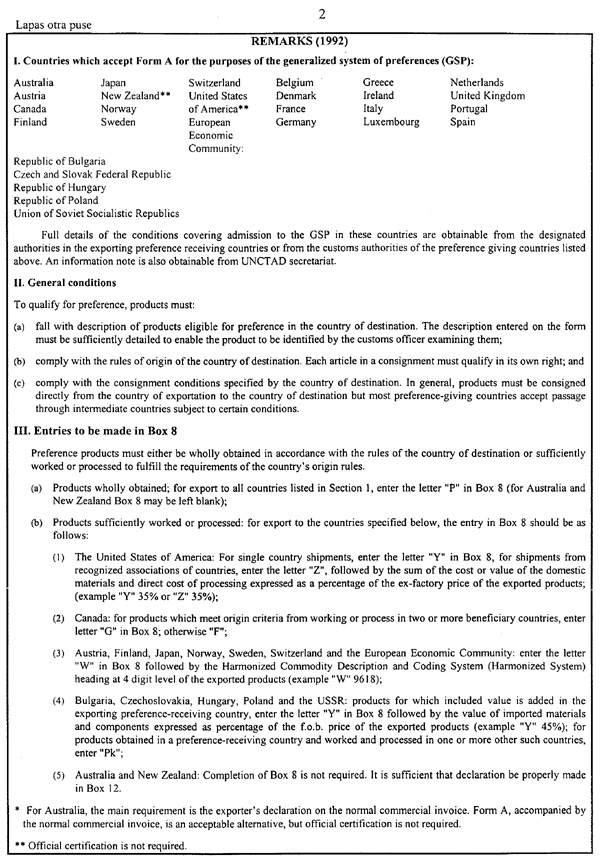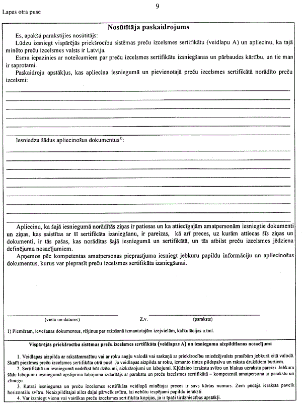 9. Preču izcelsmes sertifikāta (tekstilizstrādājumiem) (2.pielikums) veidlapas un vispārējās priekšrocību sistēmas preču izcelsmes sertifikāta (veidlapas A) (3.pielikums) veidlapas formāts ir A4 (210 x 297 mm). Ir pieļaujama -5 mm vai +8 mm atkāpe no noteiktā izmēra. Izmantojams balts rakstāmpapīrs (bez mehāniskiem celulozes piemaisījumiem), kas sver vismaz 25 g/m2. Sertifikātam ir zaļš smalki tīklots fons.