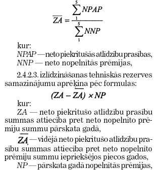2.4.2.2. izlīdzināšanas tehnisko rezervi samazina, ja neto piekritušo atlīdzību prasību summas attiecība pret neto nopelnīto prēmiju summu (ZA) pārskata gadā ir lielāka nekā šīs attiecības vidējais lielums iepriekšējos piecos gados. Vidējo neto piekritušo atlīdzību prasību summas attiecību pret neto nopelnīto prēmiju summu () iepriekšējos piecos gados aprēķina pēc formulas: