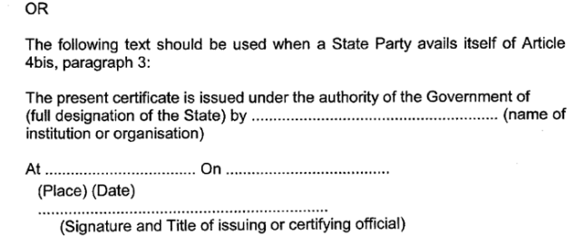 3.(a) A State Party may authorize an institution or an Organization recognised by it to issue the certificate. Such institution or organization shall inform that State of the issue of each certificate. In all cases, the State Party shall fully guarantee the completeness and accuracy of the certificate so issued, and shall undertake to ensure the necessary arrangements to satisfy this obligation.